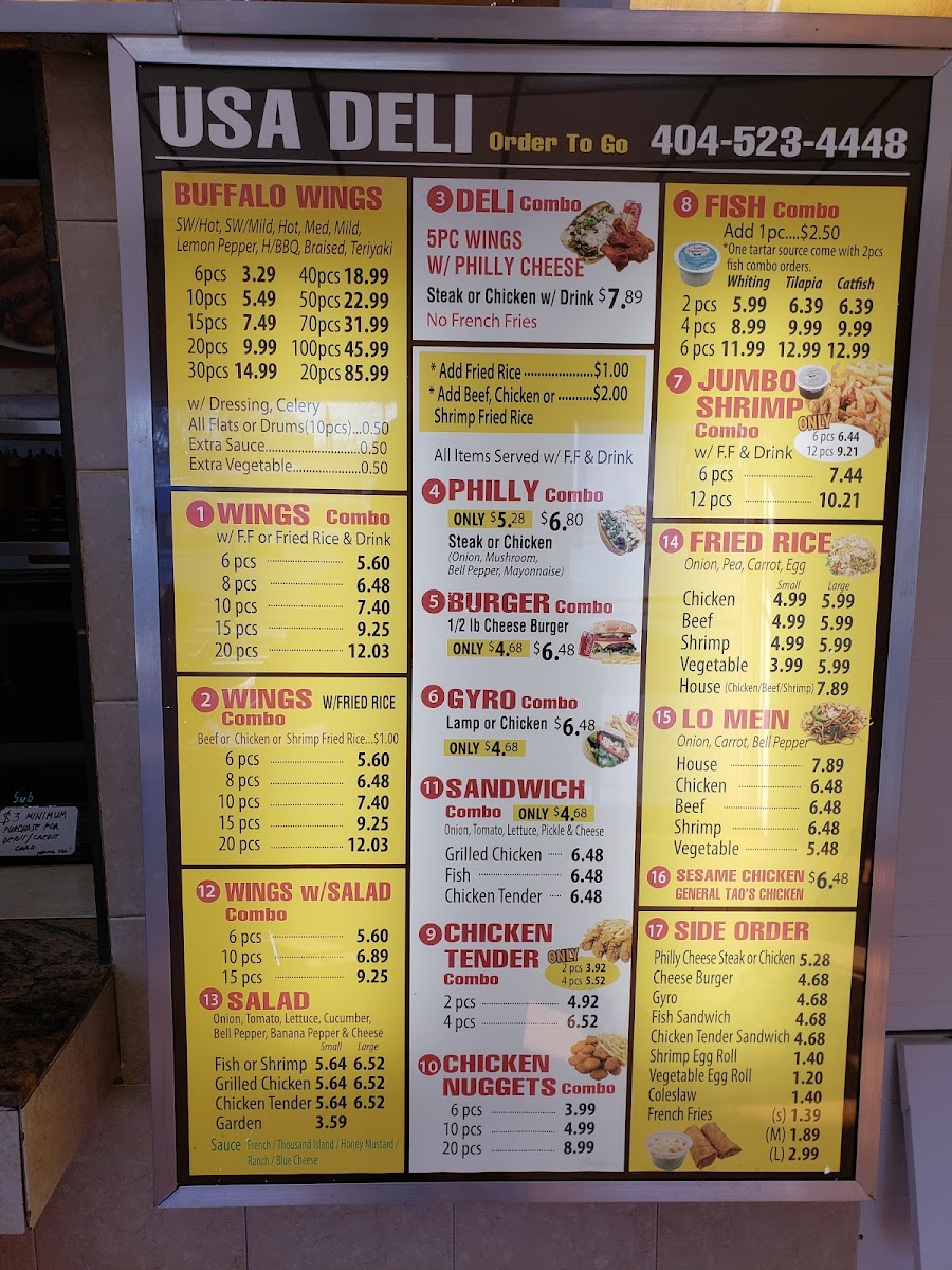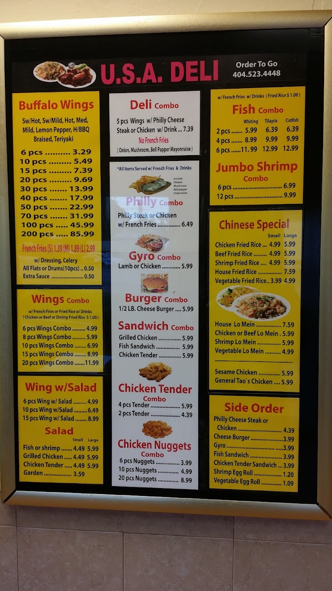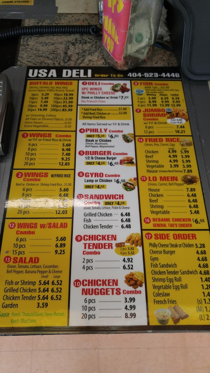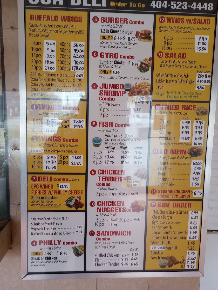 Introducing the menu at U.S.A. Deli, a hidden gem located at 1156 Memorial Dr SE, Atlanta. This beloved establishment has become a favorite for wing lovers, drawing in loyal customers with its mouthwatering offerings. Renowned for their hot wings, patrons rave about the fresh flavors and generous portions. A standout highlight is the 10-piece wing combo paired with crispy fries that customers adore, all at an unbeatable price.